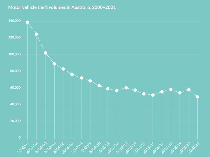 Overall, however, theft is less of a problem in Australia. NMVTRC data show that motor vehicle theft declined markedly between 2000 and 2021.